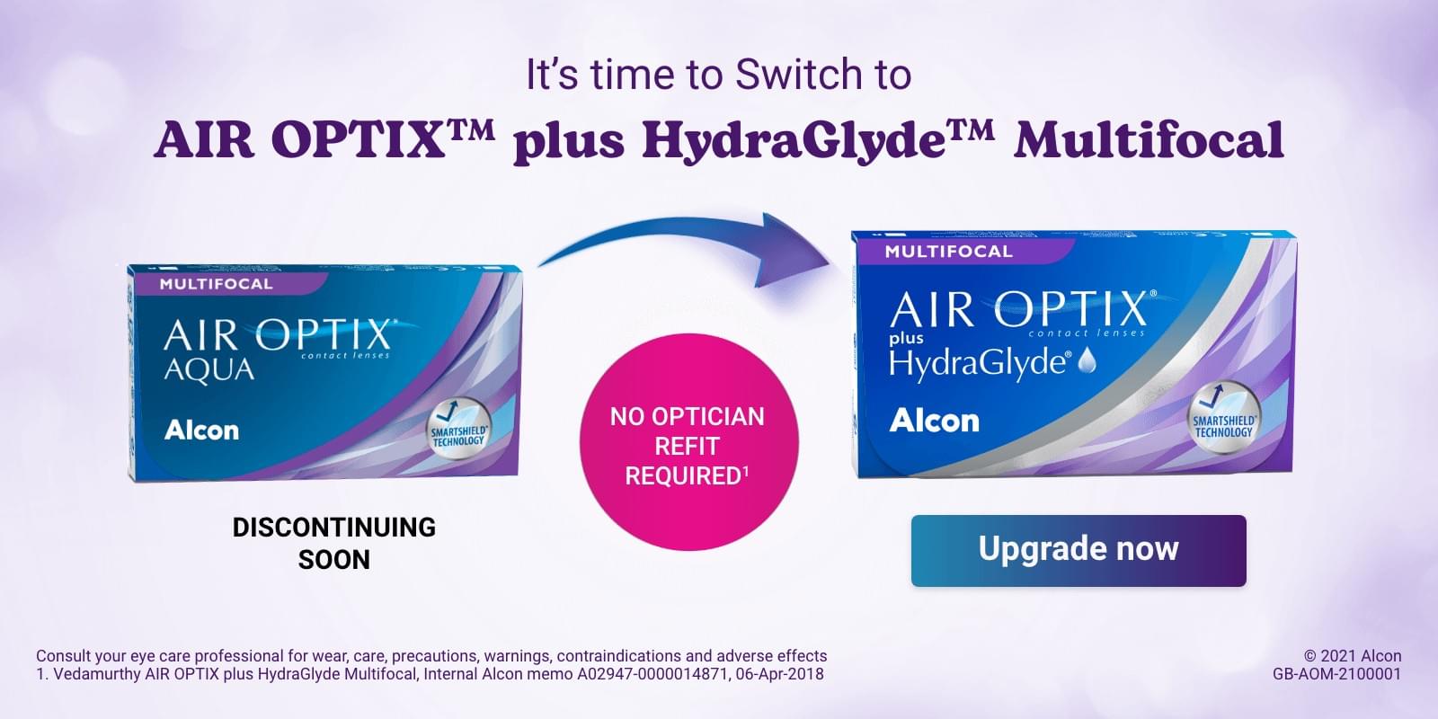 Users of the Air Optix Aqua Multifocal contacts can start using the new Air Optix Plus Hydraglyde Multifocal lenses without a new prescription.